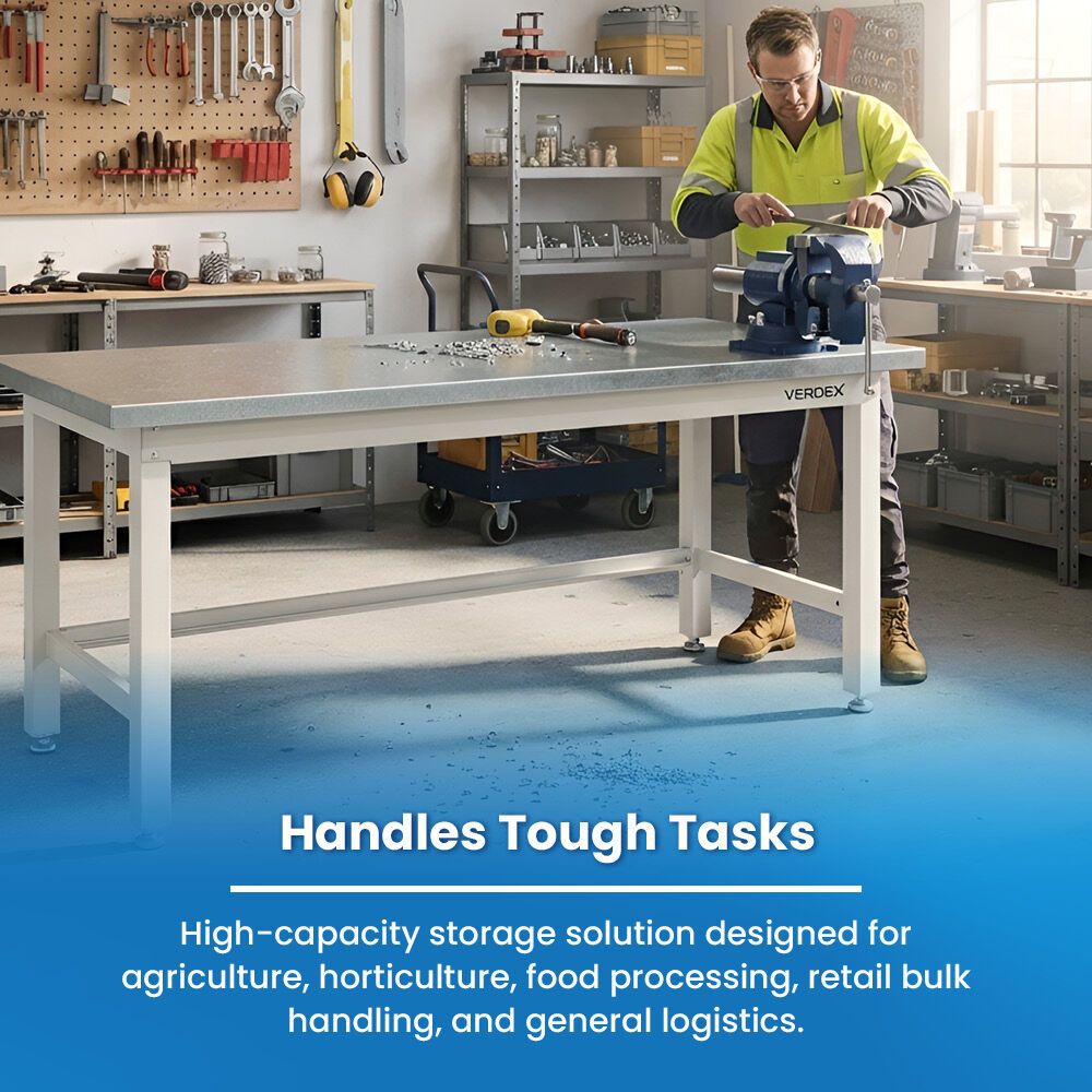 The 2100mm Workbench with Galvanised Top & Vice is designed for demanding industrial and commercial environments where strength, stability, and reliability matter. Its galvanised steel surface stands up to harsh use, making it ideal for heavy assemblies, dirty work, and high-impact tasks.
