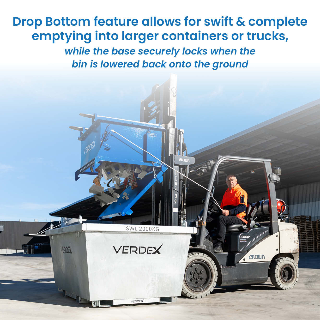The Verdex 500L Drop Bottom Bin (Solid Sides) is designed to optimise industrial waste storage and disposal. Its innovative drop-bottom base enables fast, complete emptying into larger bins or trucks while securely locking when lowered, preventing spills and increasing safety.