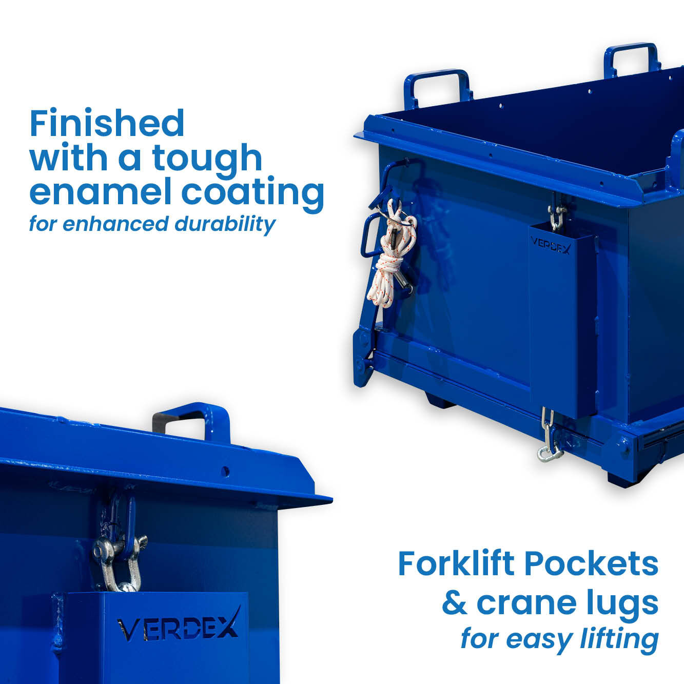 The Drop Bottom Bin features forklift pocket/crane lugs for easy lifting. If you need extra mobility, there’s an optional wheel kit. Finished with a durable enamel coat, it’s designed to last in tough conditions.