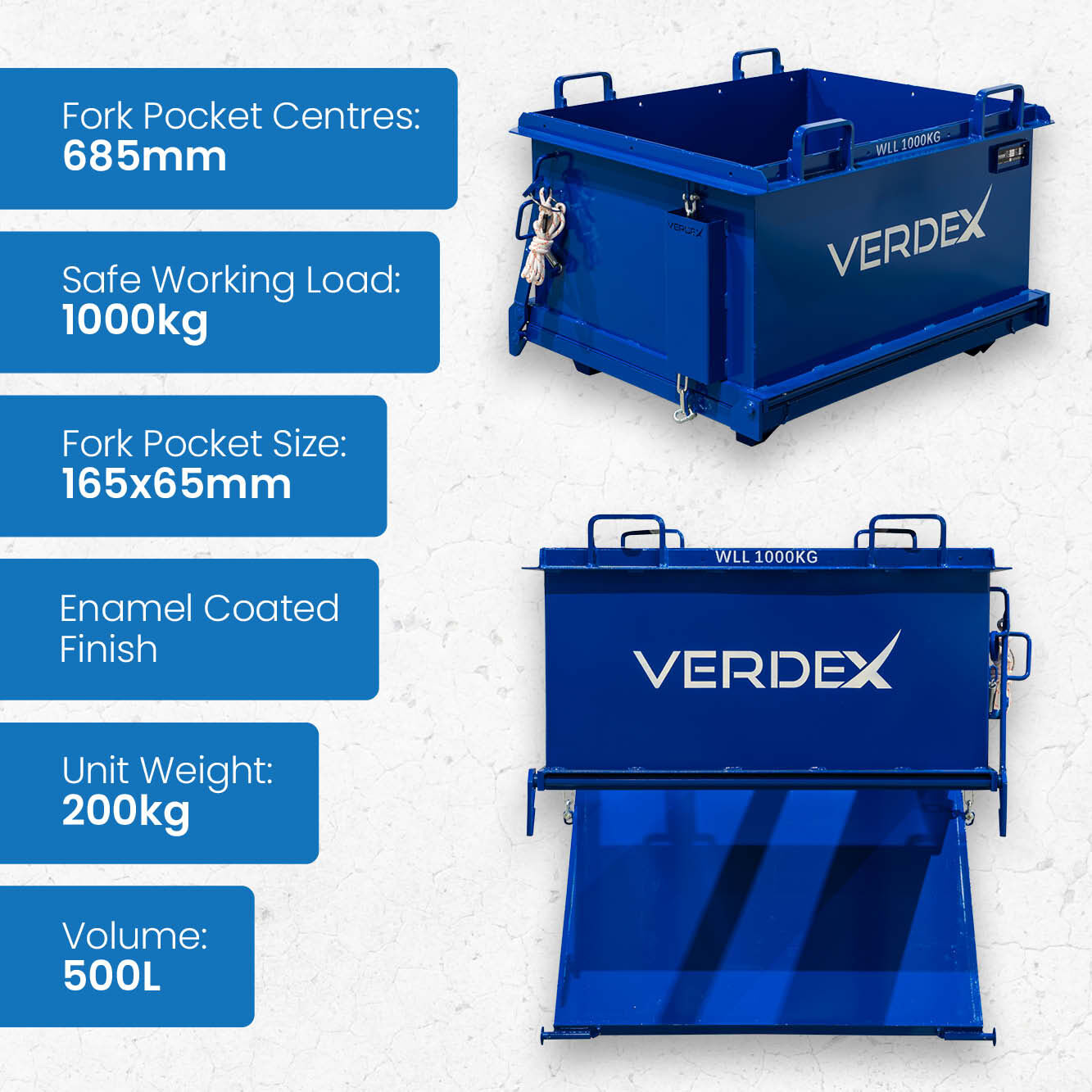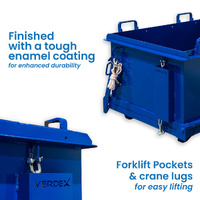 This Drop Bottom Bin offers a generous 500L volume and a safe working load of up to 1000kg, making it ideal for heavy-duty waste handling. Its compact dimensions and forklift-compatible pockets ensure easy manoeuvrability and seamless integration with standard material handling equipment.