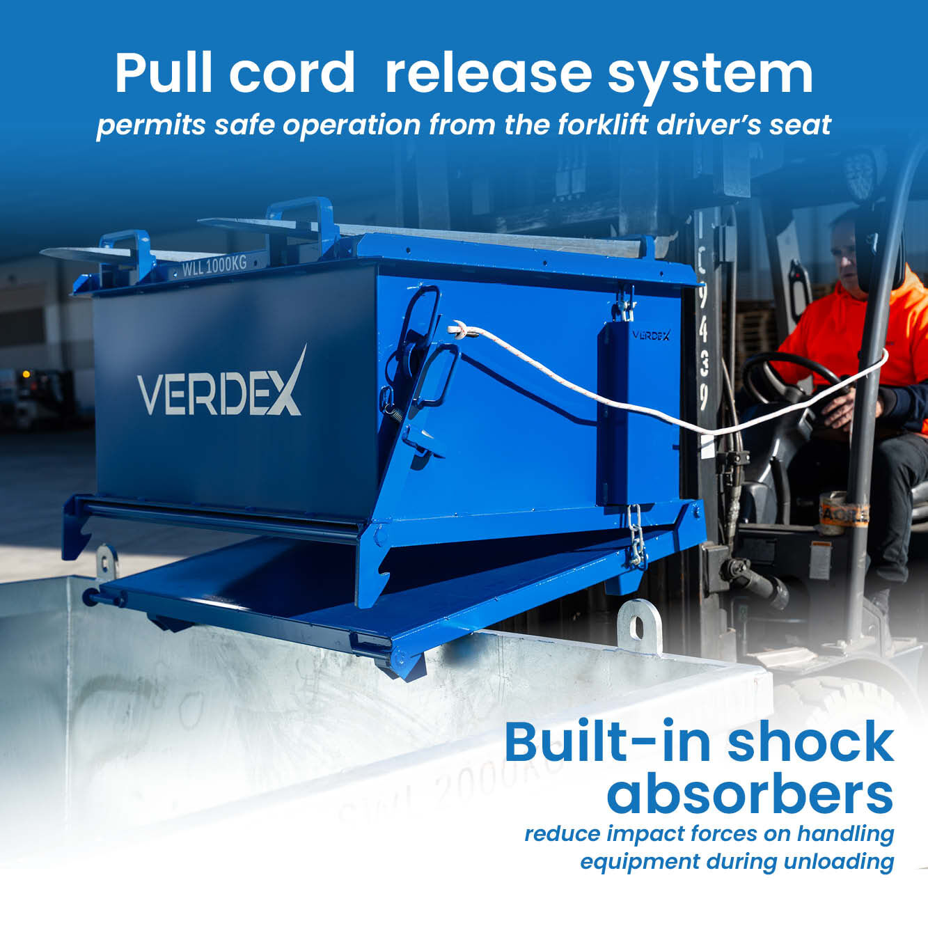 Moving it around is simple too. You can use a forklift or overhead crane, whichever suits your site. The pull cord release lets you open the base right from the forklift seat, making the whole process smoother. It also has a shock-absorbing system that protects your equipment from impact during emptying.