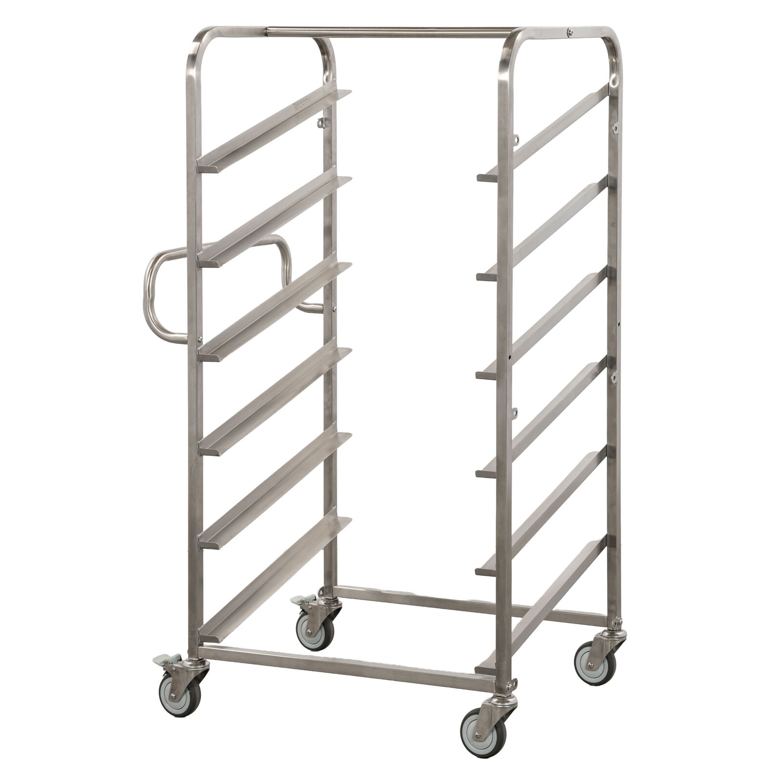 The trolley features six forward-tilting shelves set at 15°, allowing bread crates to sit securely while remaining easy to access. This angled design reduces the need for awkward lifting and reaching, helping improve ergonomics during loading and unloading. With a capacity to hold six bread crates, the trolley supports efficient transport between production, storage, and dispatch areas.