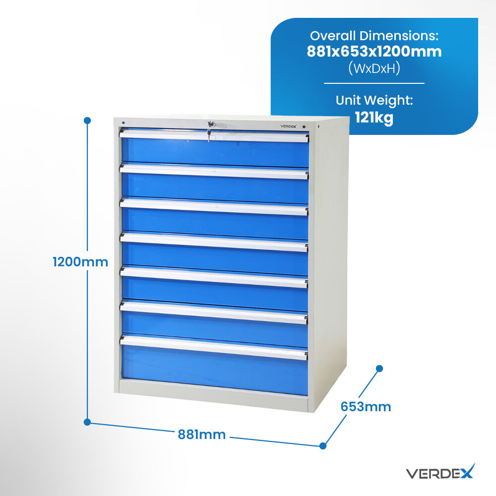 Verdex's 7 Draw Industrial tooling cabinet are ideal for industrial applications and workshops, mechanics and warehouses. The sliding drawers are a welded strengthened single rail design coupled with high quality mechanical bearings for long lasting smooth operation.