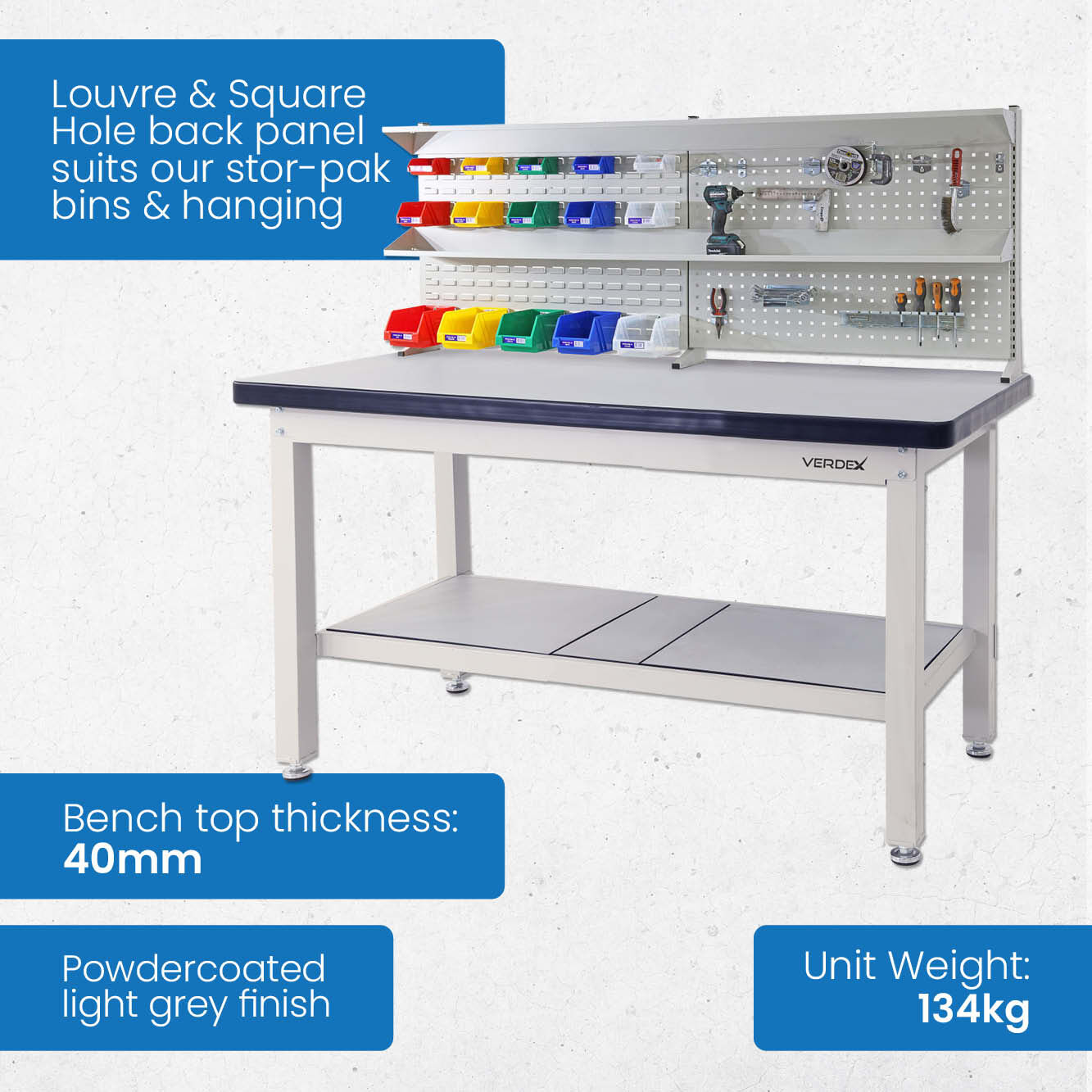 Supplied with a back panel and shelf, this workbench kit helps maximise vertical space and improve your workspace organisation. The back panel is ideal for storing tools, parts bins, or frequently used items, keeping them within easy reach while freeing up benchtop space.