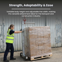 The V2461 Pallet Hook features variable body height and adjustable tine width, making this versatile attachment ideal for the transport and construction industry. Load balancing is via the moveable lifting ring. The Pallet Hook has been designed & certified in accordance with Australian Standard AS 1418.1