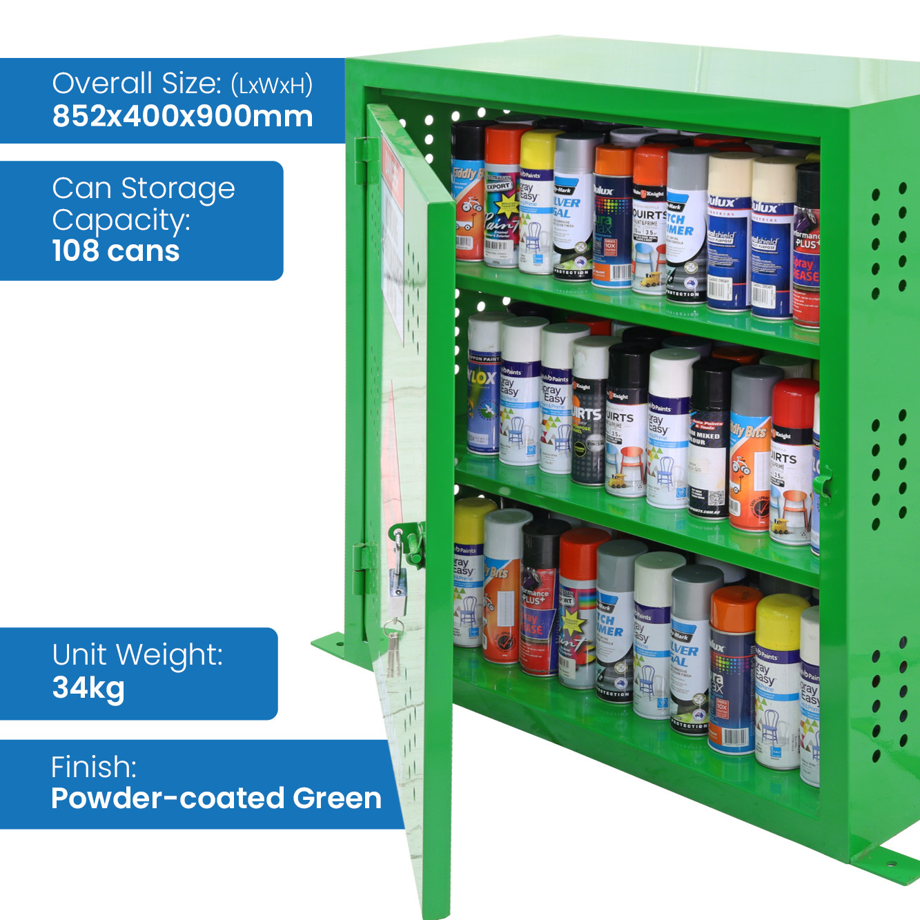 The Aerosol Cage is designed to accommodate up to 108 aerosol cans, with a distance between shelves of 295mm (top), 250mm (middle), and 270mm (bottom). This shelving configuration provides plenty of space for storing cans of varying sizes while keeping them organised and easy to access. The adjustable shelving allows for customisation, so you can modify the configuration to suit your storage requirements.