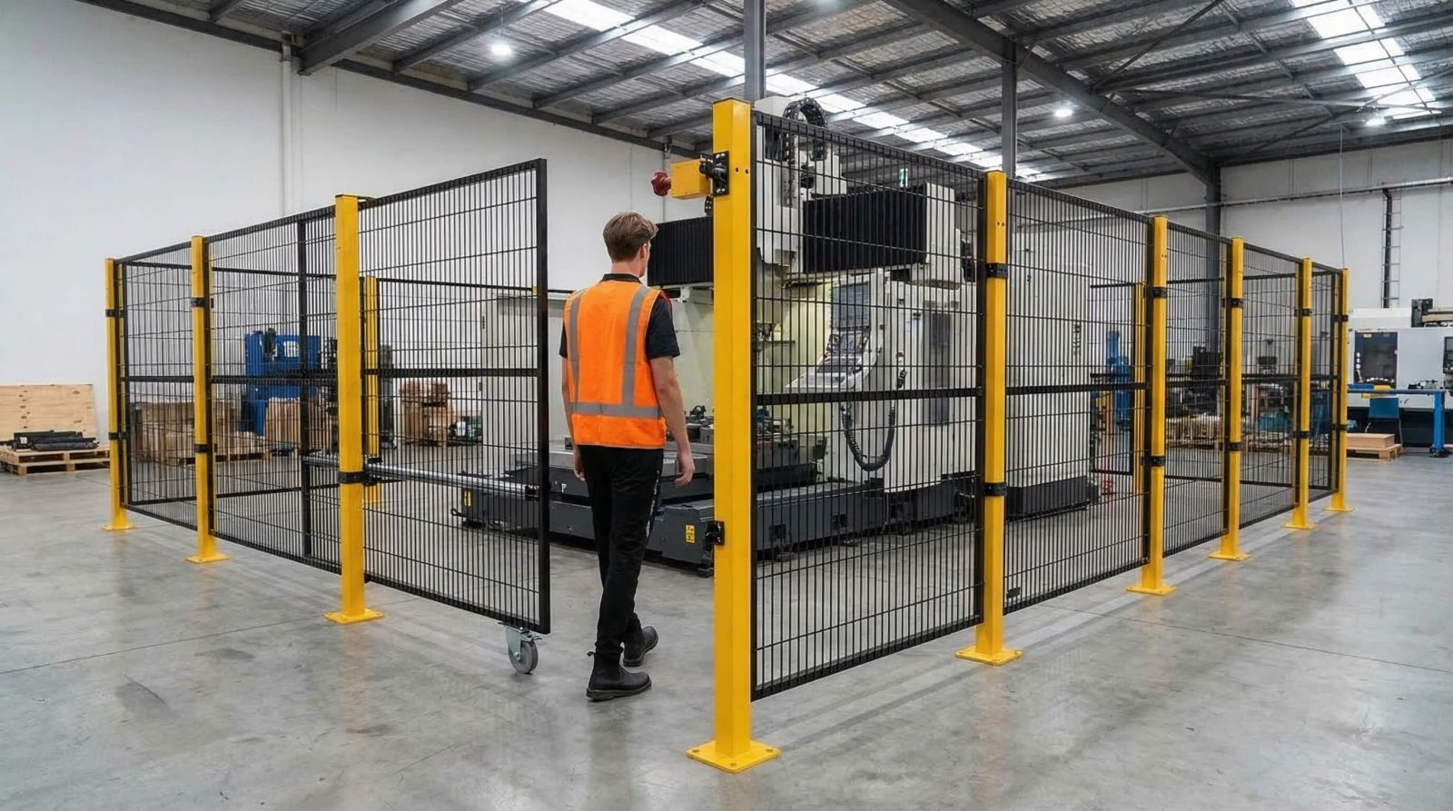 Modular safety fencing creates a controlled perimeter around these machines, ensuring only trained personnel can enter operational areas.