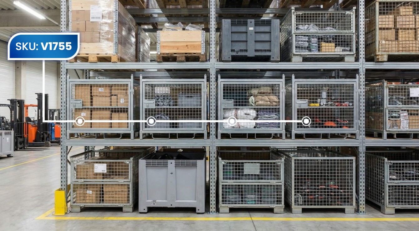 Various cages and bins organised on pallet racking in a tidy warehouse