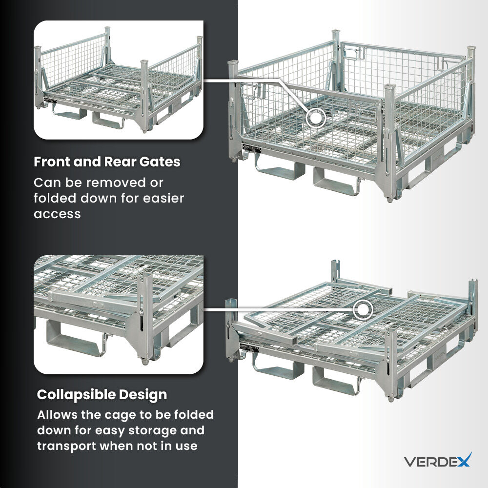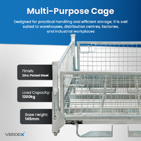 Manufactured from zinc-plated steel, the cage provides durability and corrosion resistance for both indoor and outdoor use. It supports a 1200kg load capacity, making it suitable for heavy industrial goods. The cage can be stacked four high statically, two high dynamically, and up to 20 high when collapsed, offering excellent flexibility for storage and transport planning.