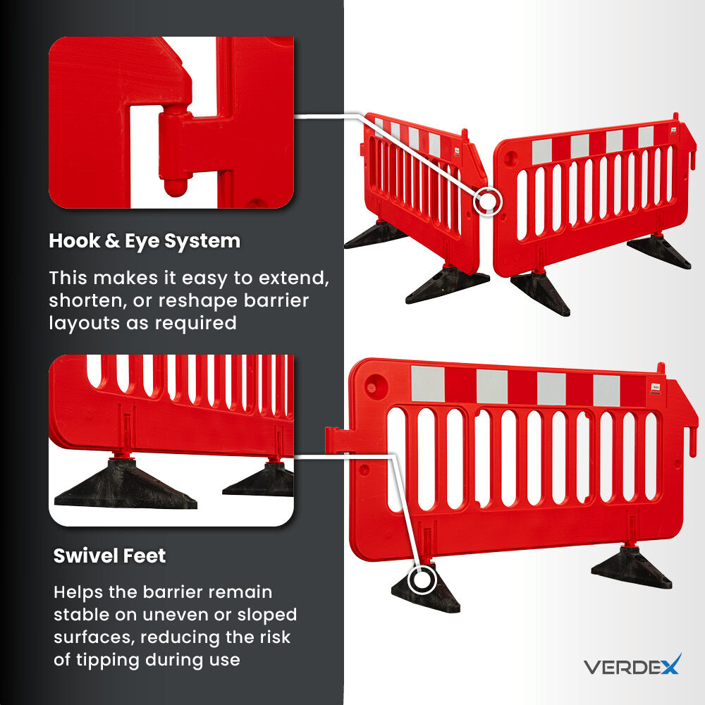 Each barrier section connects using a simple hook and eye system, allowing multiple units to be joined together quickly. This makes it easy to extend, shorten, or reshape barrier layouts as required. The design supports rapid deployment for short-term tasks while also being suitable for longer-term site arrangements.