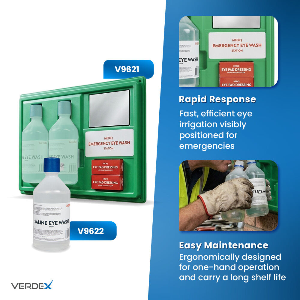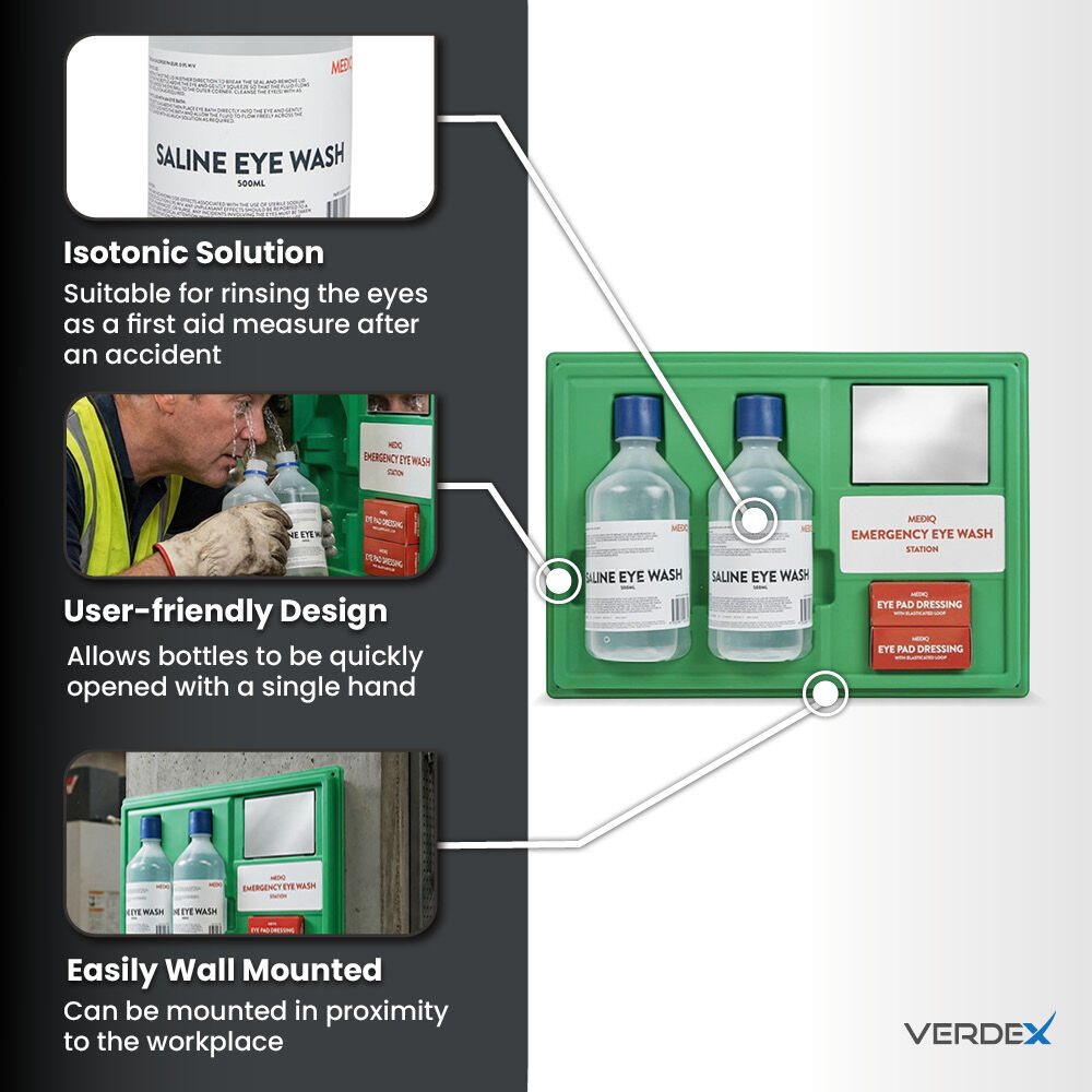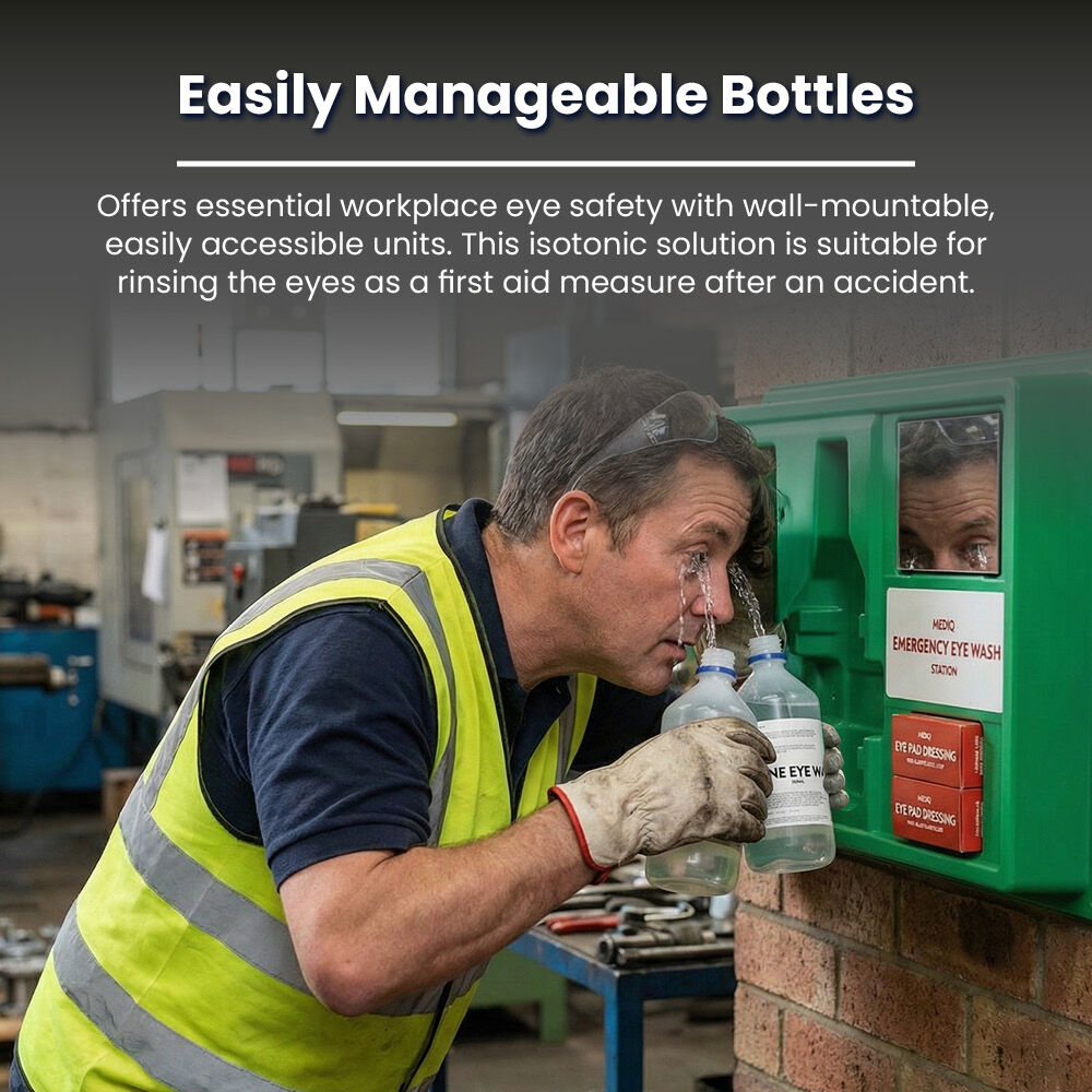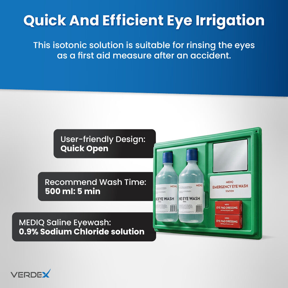 2. Effective Irrigation: MEDIQ Saline eyewash solutions used in eyewash stations contain a 0.9% sodium chloride solution that mimics the natural salt content of eye fluid. This isotonic solution is safe and effective for rinsing the eyes and is designed to remove dust, dirt, and other contaminants from the eye without causing more irritation. The goal is to clean the eyes thoroughly while preventing additional damage.