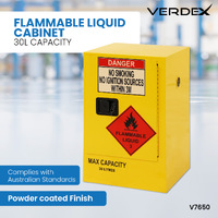 The Flammable Liquid Cabinet from Verdex, with a 30-litre capacity, offers a compact yet effective solution for safely storing small quantities of flammable liquids. Designed for use in industrial, laboratory, and commercial settings, this cabinet ensures secure and compliant storage of hazardous substances. Constructed from high-quality steel, the cabinet features a double-walled design with a durable, self-closing door equipped with a reliable locking mechanism. This robust construction provides superior protection against fire and accidental spills, while the built-in sump captures any leaks to maintain a safe environment. Inside, the cabinet includes an adjustable shelf to accommodate various container sizes, enhancing flexibility and organisation. The bright yellow finish with clear hazard labels ensures high visibility and easy identification, promoting safety and compliance with regulations. The Flammable Liquid Cabinet is ideal for environments where space is limited but safety is paramount. Invest in this cabinet to enhance your workplace safety protocols and ensure the secure and organised storage of flammable liquids.