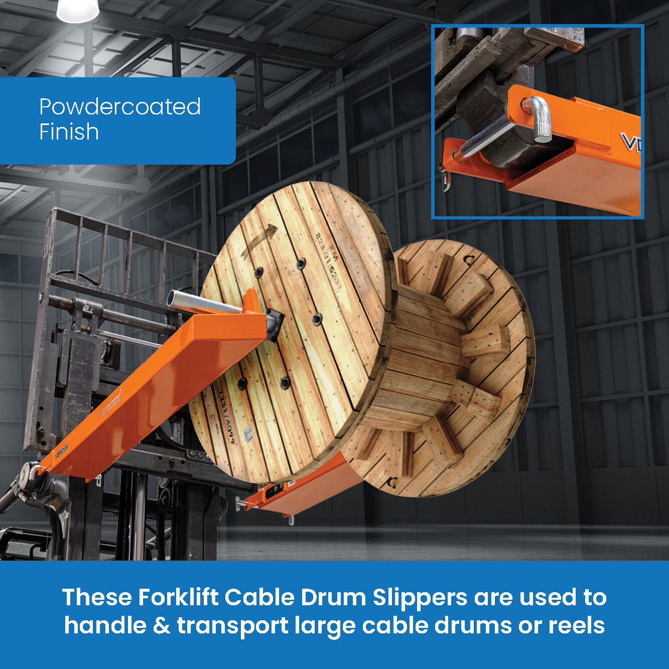 The Verdex Forklift Cable Drum Slippers are specifically engineered to ensure the safe handling, lifting, and transportation of cable drums using a forklift. These slippers are an efficient solution for managing cable drums in numerous different industrial settings, desigend for both safety and ease of use.