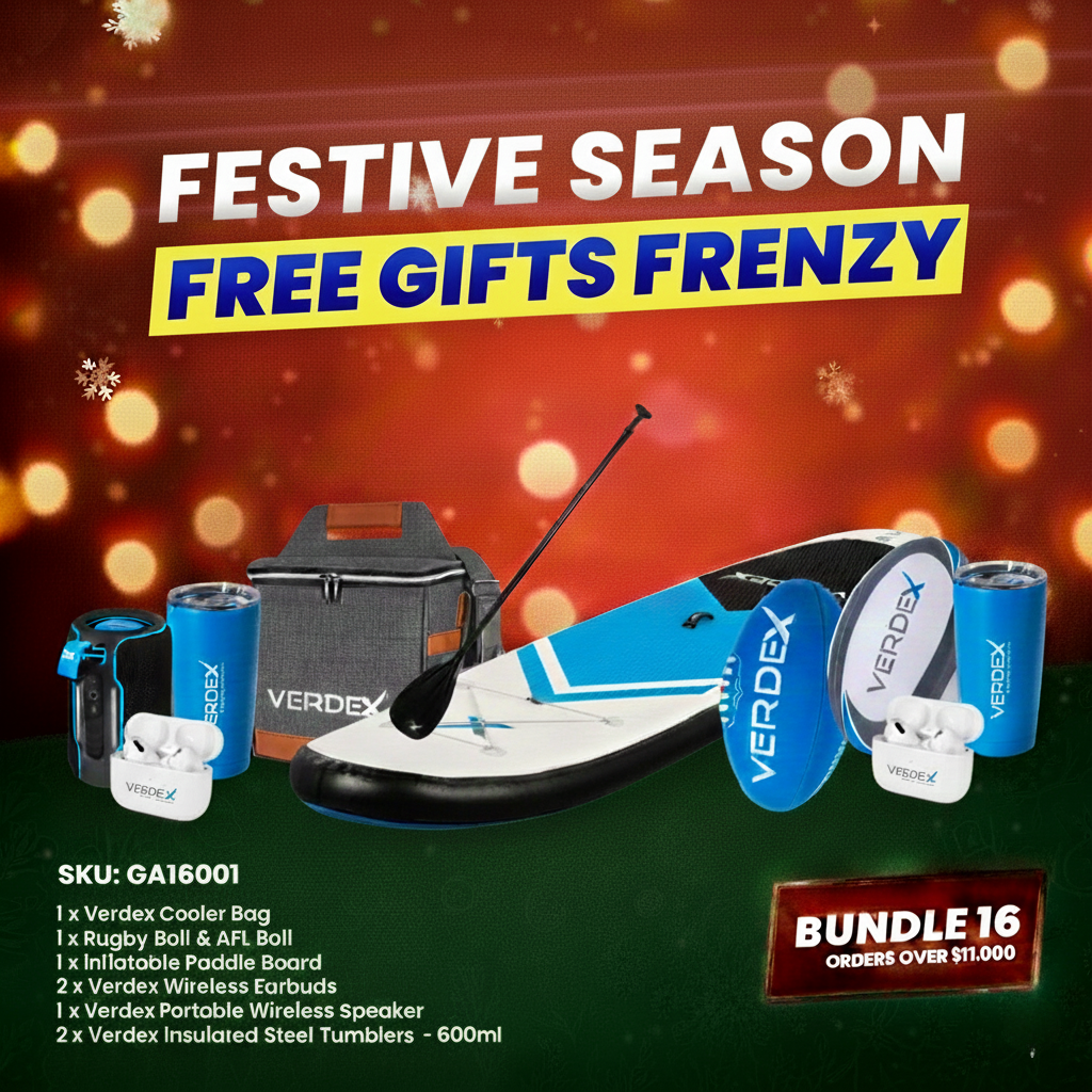 Includes: 2 Verdex Insulated Steel Tumblers + 2 Verdex Wireless Earbuds + Verdex Cooler Bag + Verdex Portable Wireless Speaker + Verdex AFL Ball + Verdex Rugby Ball + Verdex Inflatable Paddle Board