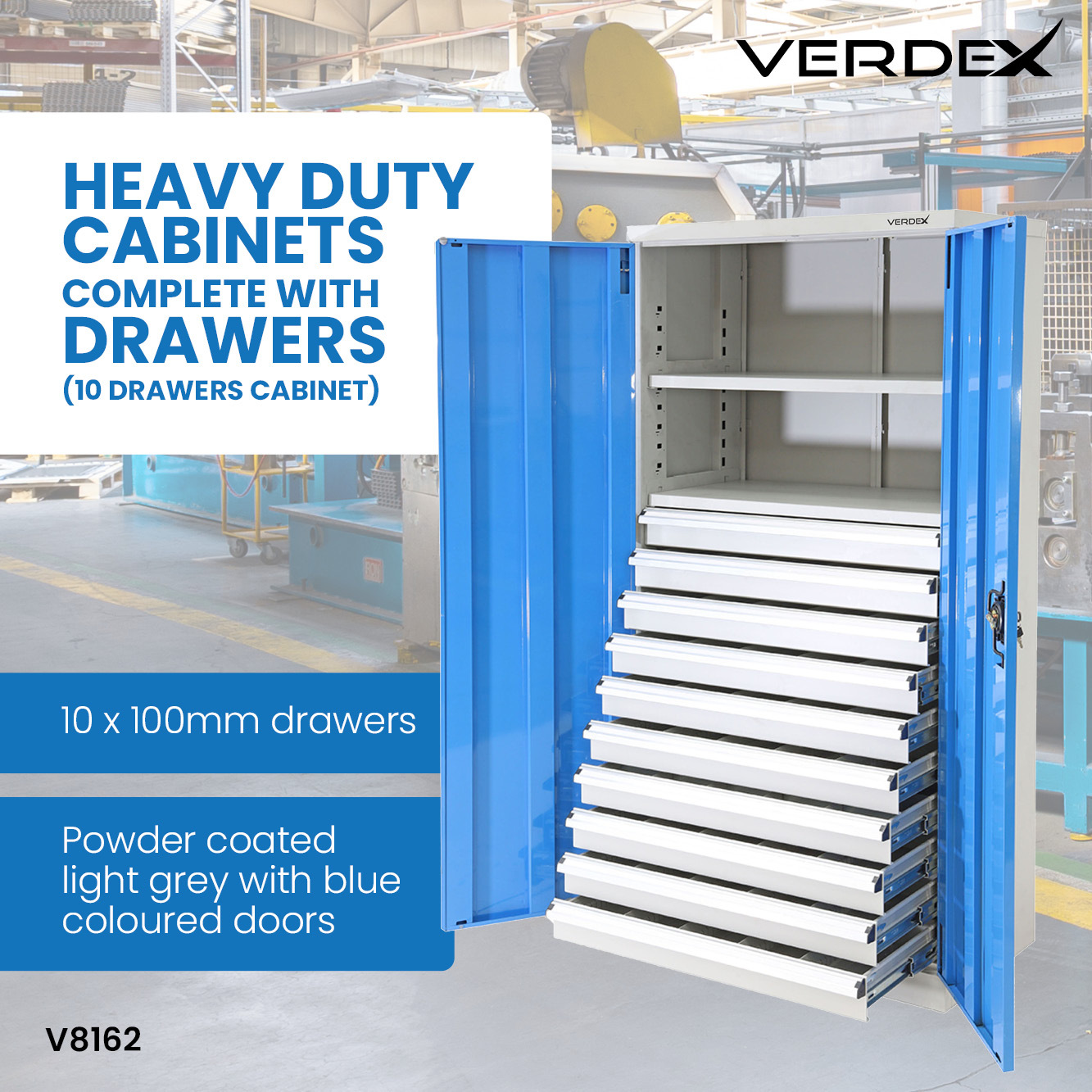 These cabinets come in a variety of configurations, making them adaptable to different storage needs. Depending on the model, the cabinets offer varying numbers of drawers in different sizes. For instance, the V8150 - 2 Drawer Cabinet comes with 1 x 100mm drawer and 1 x 200mm drawer, while the V8151 - 4 Drawer Cabinet includes 2 x 100mm drawers and 2 x 200mm drawers. There are also options like the V8160 - 8 Drawer Cabinet, which features 8 x 100mm drawers, or the V8170 - 7 Drawer Cabinet, with 2 x 100mm drawers and 5 x 200mm drawers. This range allows you to select the configuration that best suits your storage needs.