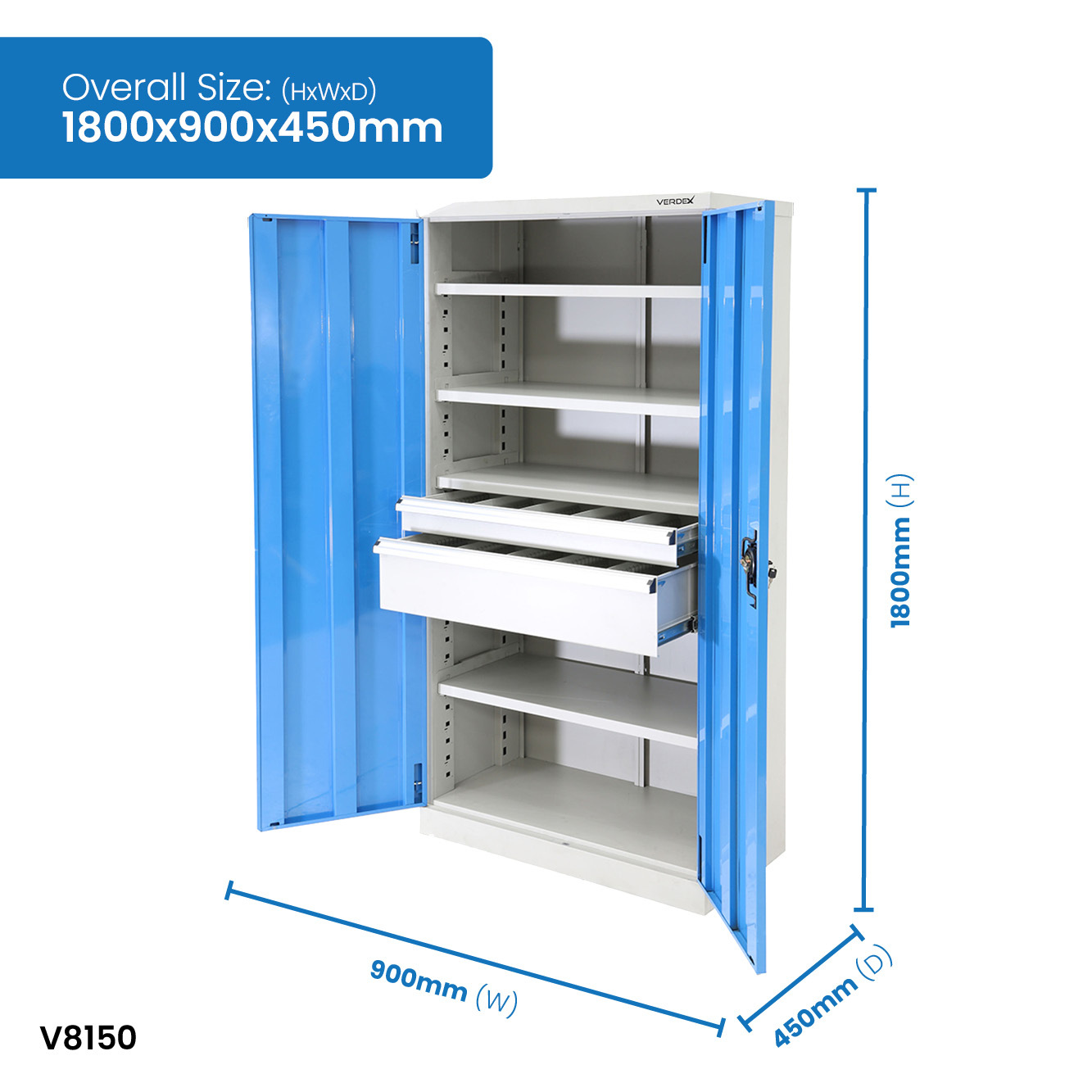 Designed with space efficiency in mind, these cabinets have a compact footprint while still providing plenty of storage space. With a height of 1800mm, width of 900mm, and depth of 450mm, these cabinets are perfect for use in environments where space is limited. Their design ensures they fit into most workspaces without taking up too much room, and the range of drawer and shelf options means you can find the right combination for your storage needs.