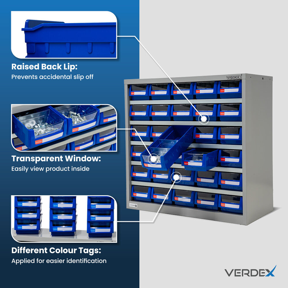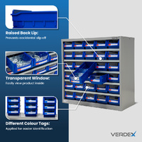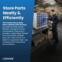 The Verdex Heavy Duty Parts Cabinet with 30 Part Trays offers a robust and organised storage solution for managing a diverse range of parts and components. Constructed from high-quality steel, this cabinet is designed to withstand the rigours of industrial environments while providing long-lasting durability. The cabinet features 30 removable trays, each designed to accommodate various sizes of parts and tools. The trays can be easily organised and accessed, allowing for efficient storage and retrieval of items. The cabinetÂ’s heavy-duty construction ensures that it remains stable and secure, even when fully loaded. Equipped with a secure locking mechanism, the cabinet helps protect valuable parts from unauthorised access, enhancing workplace security. Its compact design maximises storage space while maintaining a small footprint, making it ideal for workshops, warehouses, and maintenance areas. The Verdex Heavy Duty Parts Cabinet with 30 Part Trays is the perfect solution for efficient, organised, and secure parts storage.
