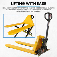 Boost your lifting capabilities with the Hi-Lift Manual Pallet Trucks, designed to enhance productivity and efficiency in various industrial settings. Ideal for warehouses, workshops, and distribution centres, these pallet trucks offer a versatile solution for handling and elevating heavy loads with ease. Featuring a robust steel construction, the Hi-Lift Manual Pallet Trucks are built to withstand rigorous use while providing dependable performance. The high-lift function allows for easy elevation of pallets to a comfortable working height, reducing the need for bending and minimising strain on operators. This feature is particularly useful for tasks such as sorting, stacking, and maintenance. The manual operation is facilitated by an ergonomic pump handle that ensures smooth and controlled lifting and lowering. Precision bearings and heavy-duty wheels offer effortless manoeuvrability across various floor surfaces, making the Hi-Lift Manual Pallet Trucks a reliable choice for diverse material handling needs. Enhance your operational efficiency and safety with the Hi-Lift Manual Pallet Trucks, combining strength, versatility, and ease of use to streamline your material handling processes.