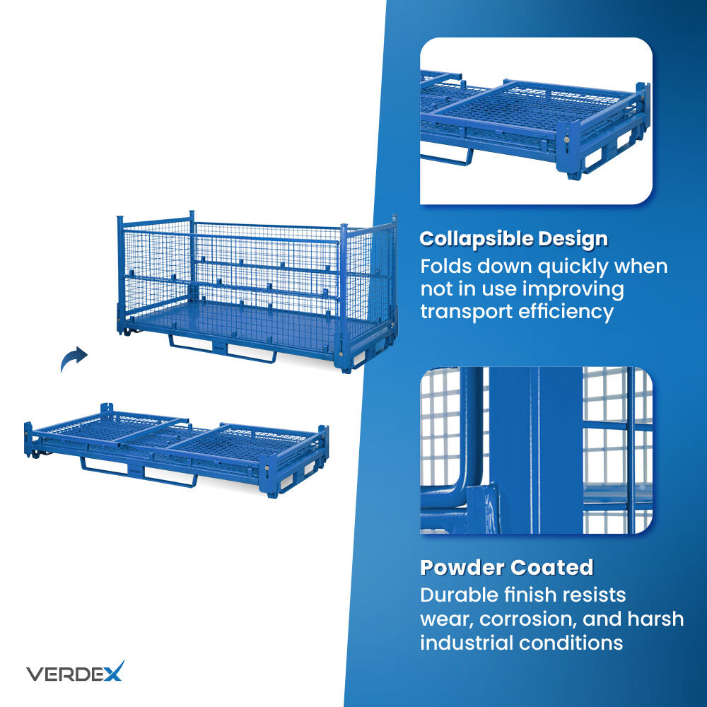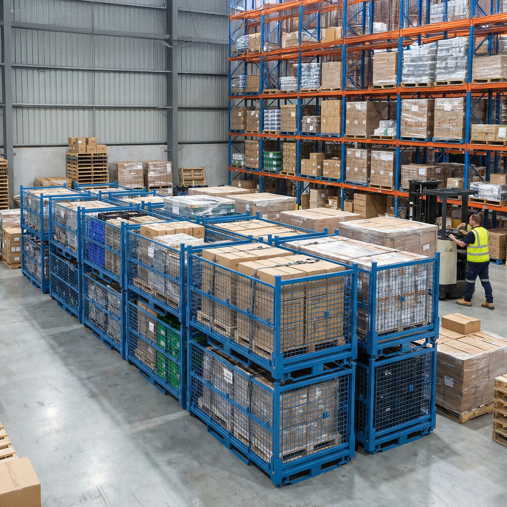 The Linehaul Stillage Cage is a heavy-duty storage and transport solution designed for warehouse, freight, and distribution environments. Built for high-volume handling, it provides secure pallet racking compatibility, efficient stacking, and easy forklift access. Its fold-down design allows compact storage when not in use, making it ideal for operations focused on maximising space, safety, and transport efficiency.