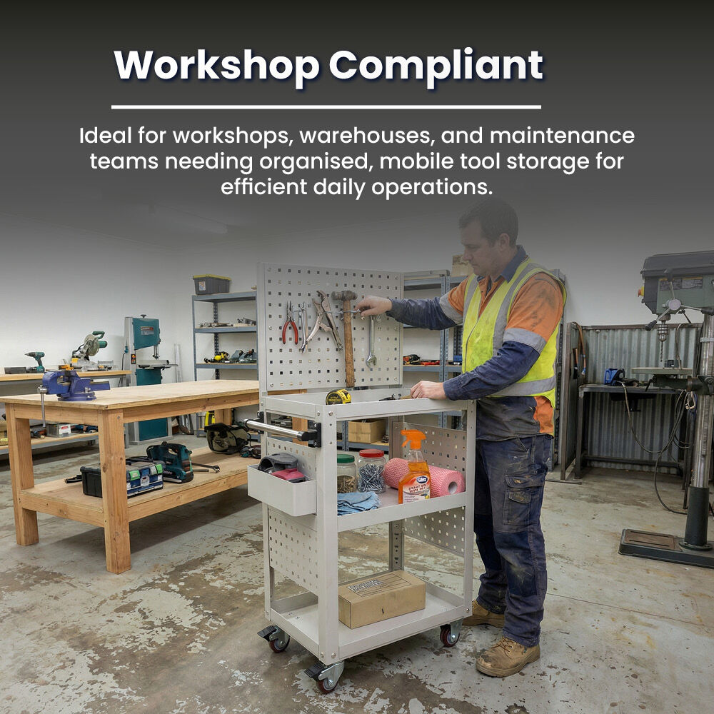 - The Peg Board Tool Trolley is an efficient and convenient solution for workshop organisation, offering ample storage space, mobility, and durability to meet the demands of industrial environments
