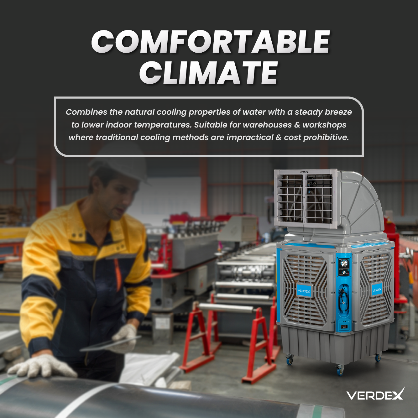 The Portable Evaporative Cooler is perfect for warehouses, manufacturing facilities, workshops, and distribution centres, where large open spaces demand reliable cooling. It is equally suited for retail showrooms, sporting events, outdoor functions, and event venues where traditional cooling solutions may be costly or impractical. By delivering fresh, cool airflow wherever it’s needed, this unit improves comfort for staff, customers, and guests while maintaining efficiency across different work and leisure environments.