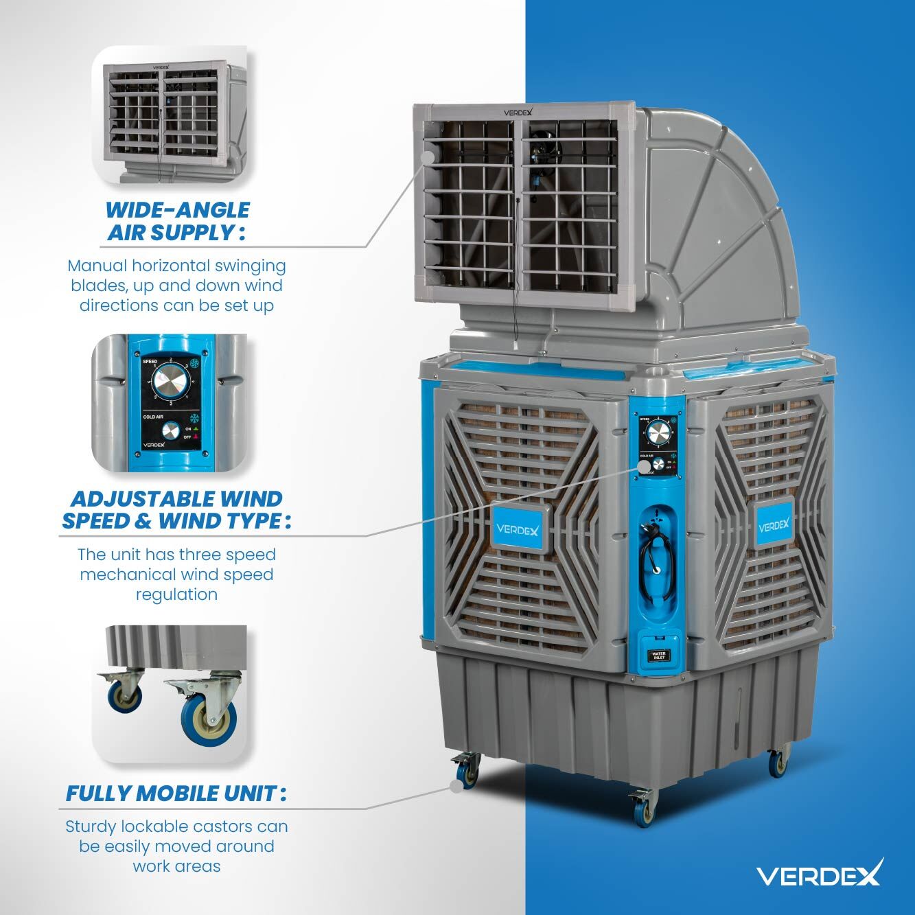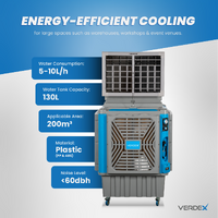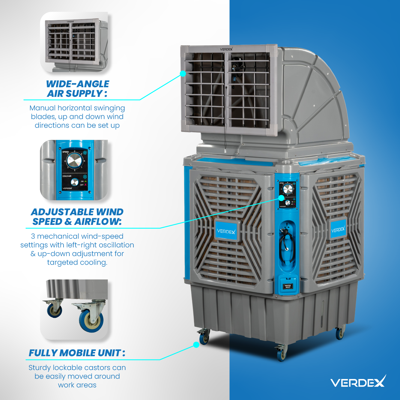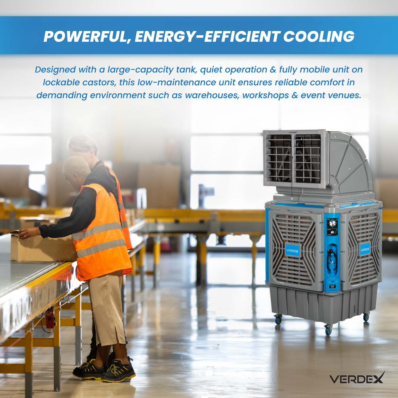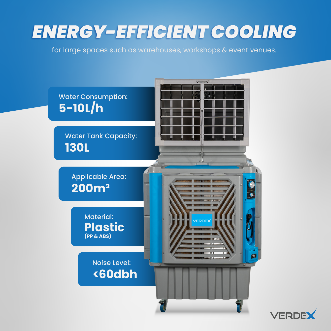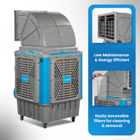 This portable evaporative cooler combines high-performance cooling with practical design. With a cooling capacity of 1.2KW and a 130L water tank, it delivers long run times without frequent refills, making it ideal for busy industrial or commercial settings. Its fully mobile design with heavy-duty lockable castors allows the unit to be moved easily and secured in place, while its durable housing ensures it can withstand tough environments. Quiet operation keeps noise levels low, and the low-maintenance design makes it easy to use and clean day after day. Altogether, it offers powerful, energy-efficient cooling while reducing reliance on costly air conditioning systems.