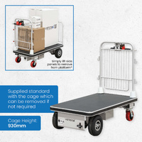 The trolley's battery-powered operation allows for smooth, controlled movement with minimal noise, making it suitable for both indoor and outdoor use. The ergonomic controls and variable speed settings offer precise handling, while the robust wheels ensure stability and easy manoeuvrability over different surfaces. Designed for durability and ease of maintenance, the Powered Platform Trolley with Cage is a versatile tool that enhances operational efficiency and safety, making it an essential asset for warehouses, factories, and logistics operations.