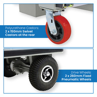 Maneuverability is key when choosing a powered trolley, and the Powered Platform Trolley with Cage ticks this box. It is equipped with pneumatic drive wheels that provide traction and smooth movement over rough or uneven surfaces. The rear castors are swivel, allowing for easy turning and improved control, while the front castors measure 260mm for more stability.