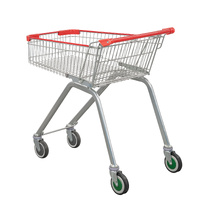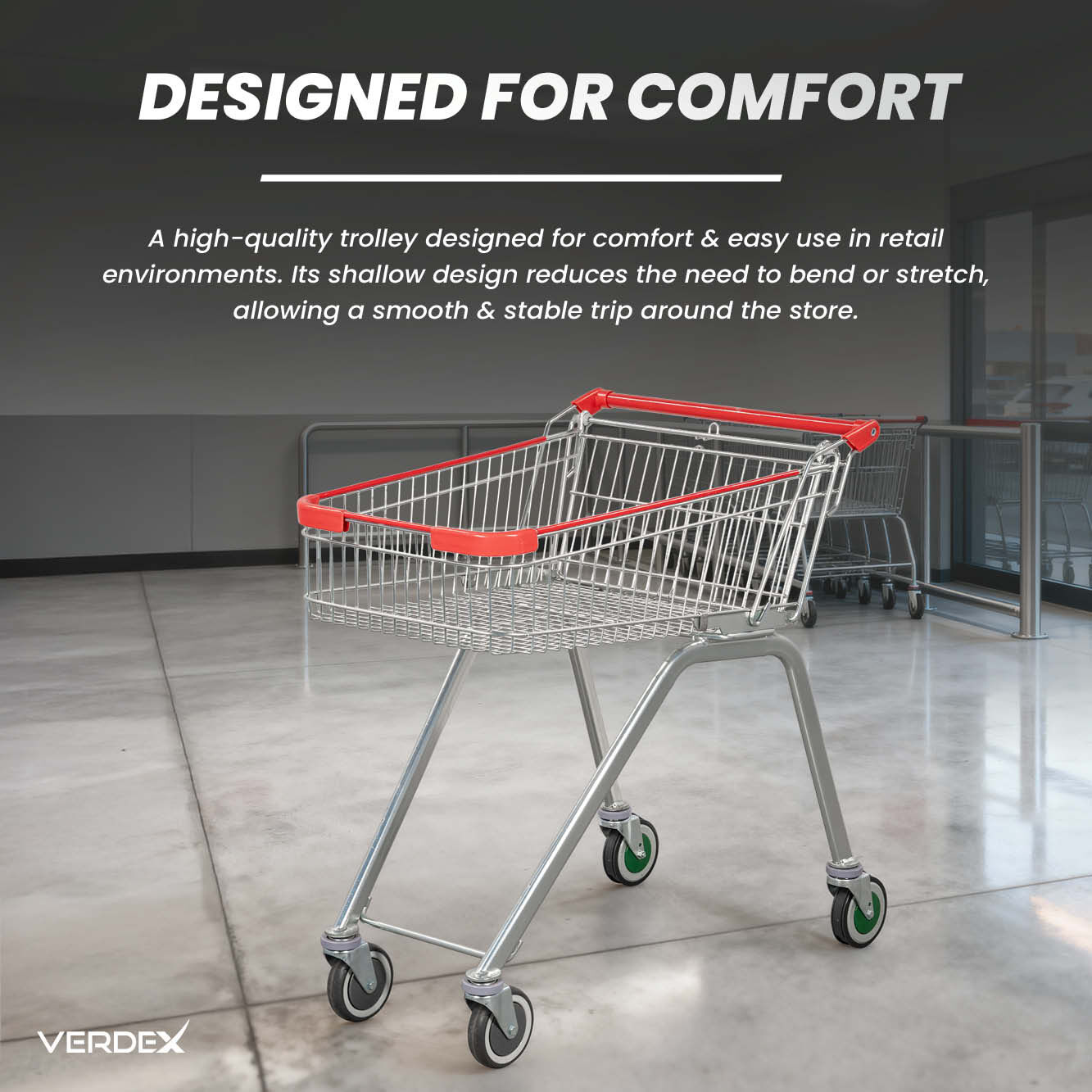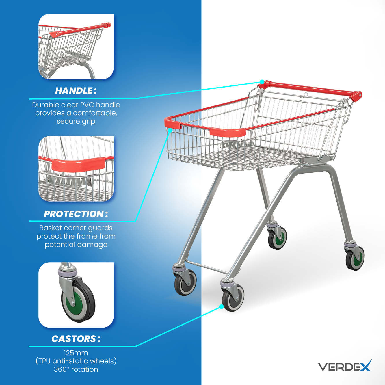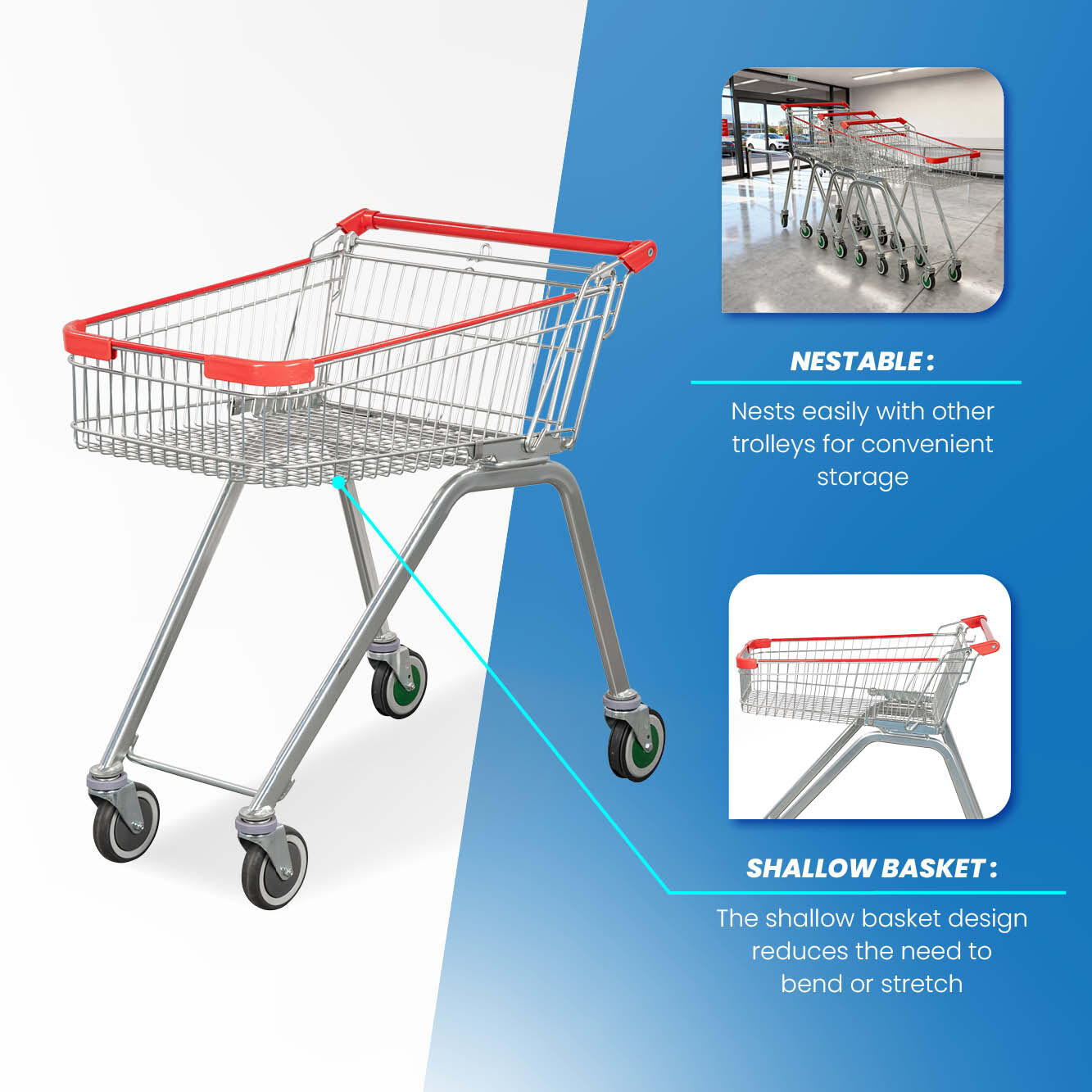 Manufactured from high-quality steel, this shopping trolley features a strong wire basket and platform for reliable performance and long-lasting use. Heavy-duty swivel wheels offer 360-degree rotation and vibration-dampening control, allowing for effortless mobility across store floors. The clear PVC handle provides a secure, comfortable grip, while corner guards protect the frame from bumps and scuffs. Easy to clean and maintain, its durable finish withstands frequent use in busy retail spaces. When not in use, the trolley nests neatly with others for simple, space-saving storage.