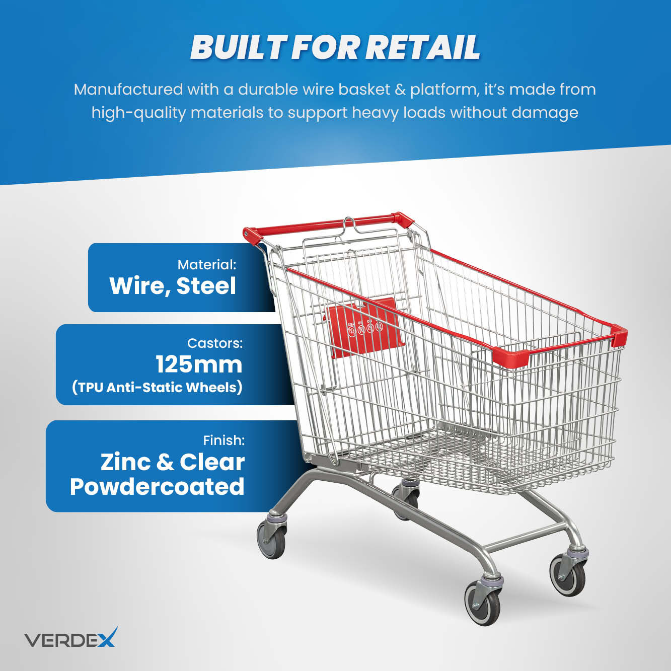 Manufactured from high-quality steel wire with a zinc and clear powder-coated finish, this trolley is made to last. The robust construction resists corrosion and damage, while the open wire frame design allows for quick cleaning and outdoor storage. Four 125mm anti-static swivel castors deliver quiet, effortless mobility, helping staff and customers move smoothly through busy store aisles.