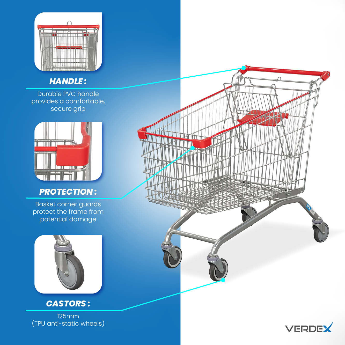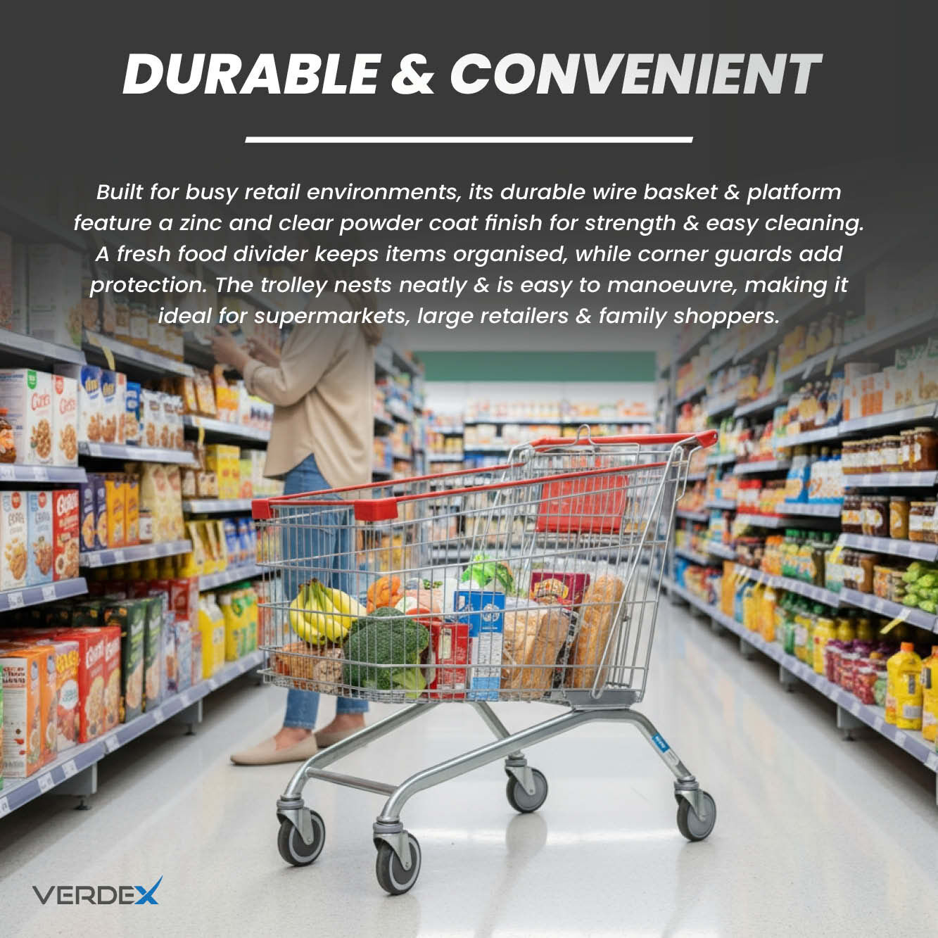What sets this trolley apart is its attention to shopper comfort and usability. A raised, moulded baby and toddler seat offers families a safe and convenient way to shop, while the fresh food divider keeps groceries neatly separated. The ergonomic PVC handle provides a comfortable grip for long use, and corner guards protect both the trolley and store fixtures from knocks and scrapes.