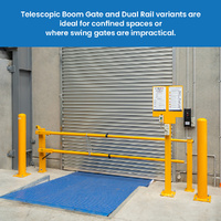 Telescopic Boom Gate and Dual Rail variants are ideal for confined spaces or where swing gates are impractical. The dual rail model is suitable for loading docks, offering fall protection. Both single and double rail models can span openings from 2.5m to 3.8m, with telescopic booms that can be manually adjusted. The included receiver post ensures secure locking, while the dual rail model features a mid-post bracket for added stability. A gas strut facilitates smooth manual operation, and rails can be cut to size if needed.