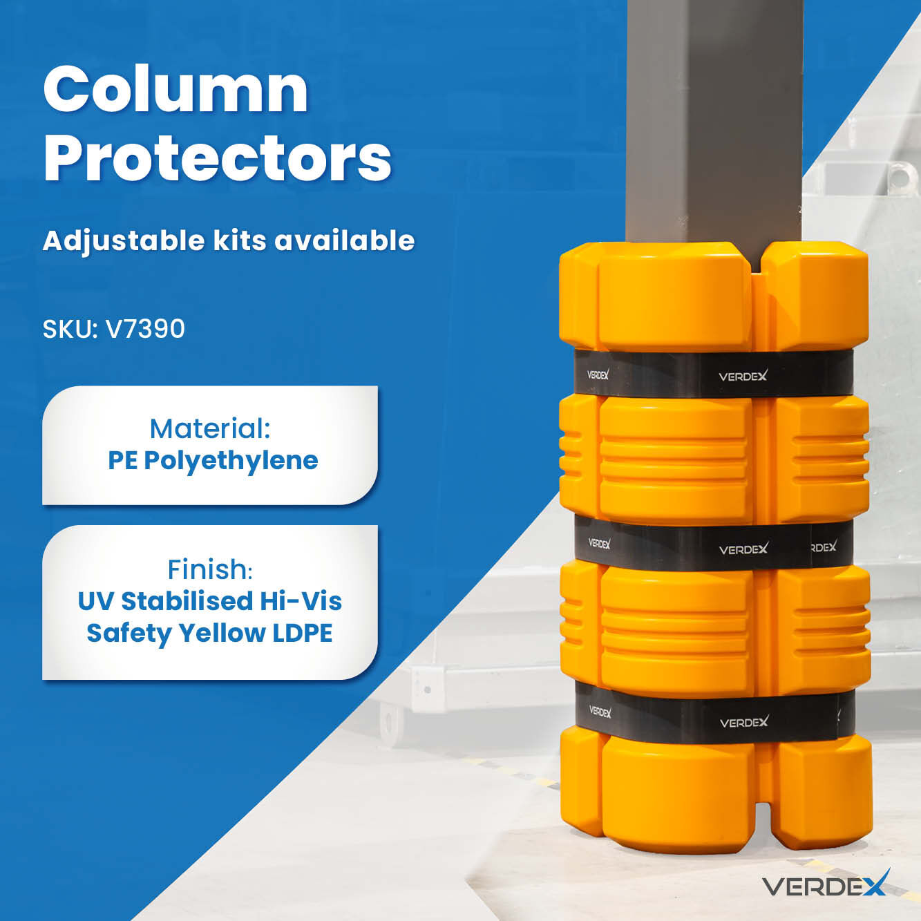 The Column Protectors range includes individual corner ends and mid sections. Made from tough, UV-stable polyethylene, they help reduce impact damage to columns, vehicles, and equipment. Suitable for busy industrial and commercial environments such as warehouses, factories, distribution centres, and car parks. Adjustable kits also available to suit square column sizes of 200mm, 300mm, and 400mm.
