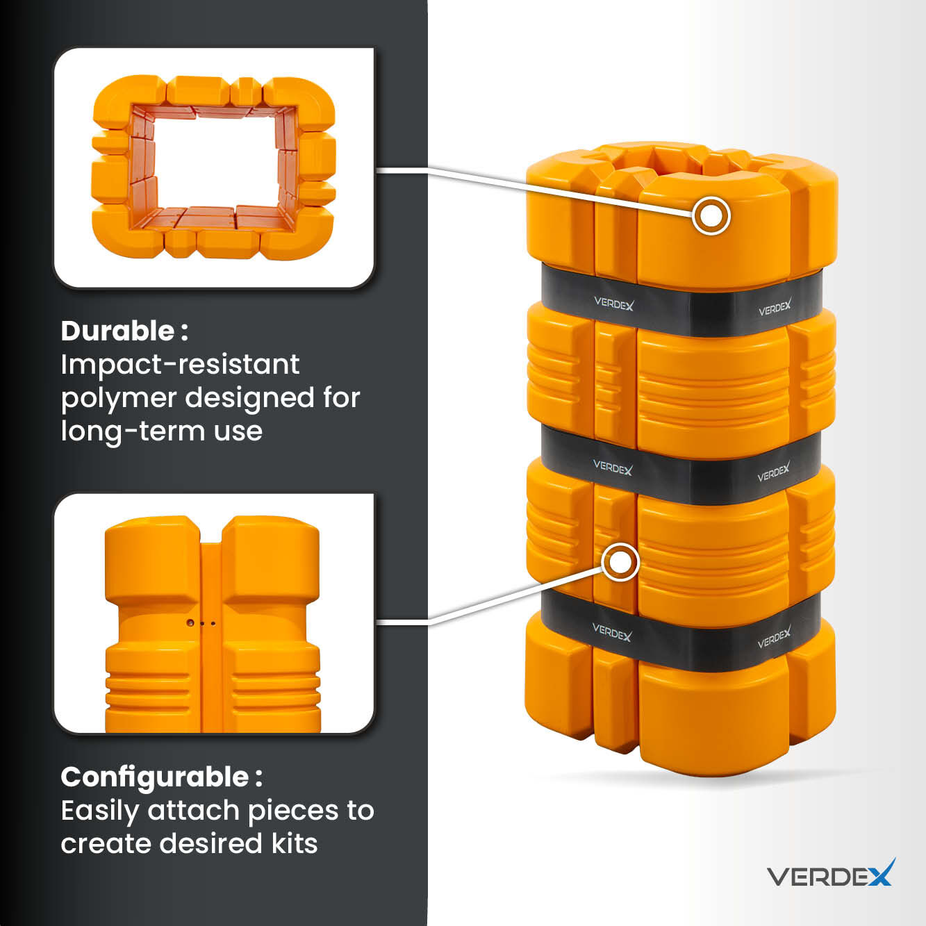 Each component is made from impact-resistant PE plastic and finished in UV-stabilised hi-vis yellow for strong visibility in busy traffic zones. Corner kits include four corner pieces and three straps, while mid-sections come in packs of two for quick expansion. All parts are easy to install, remove, and adjust as site layouts change, making this a practical long-term solution for reducing vehicle, forklift, and equipment damage.
