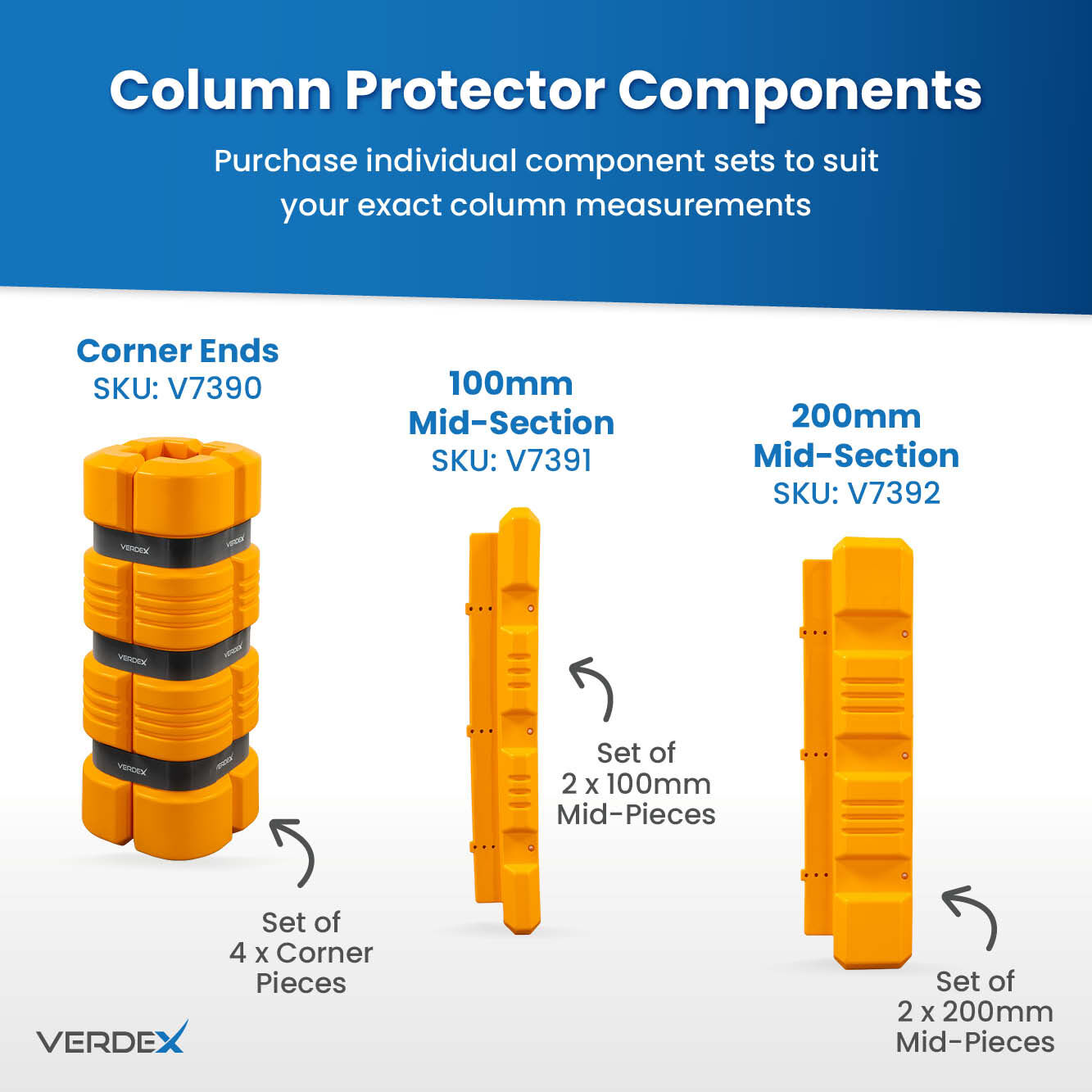 The Column Protector system provides a flexible, modular way to safeguard posts of different sizes. The range includes corner ends and mid-section extensions in 100mm or 200mm widths, allowing you to build the exact level of protection your site requires. The standard kit suits 200x200mm to 250x250mm square posts, and mid-sections can be added to cover even larger columns.