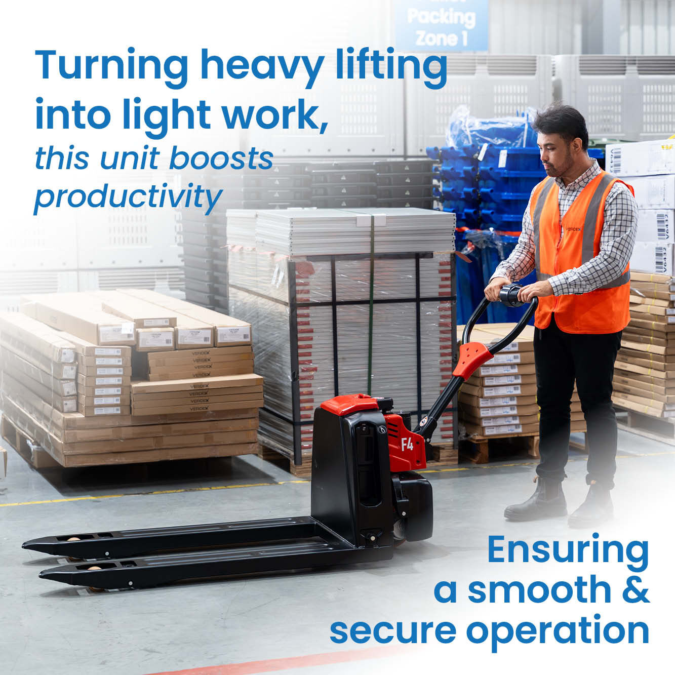 Ideal for warehouse aisles, freight areas, and commercial stockrooms, the Verdex Electric Pallet Truck handles frequent lifts and tight turns with ease. It’s especially suited to fast-paced environments where control, speed, and operator comfort are key.