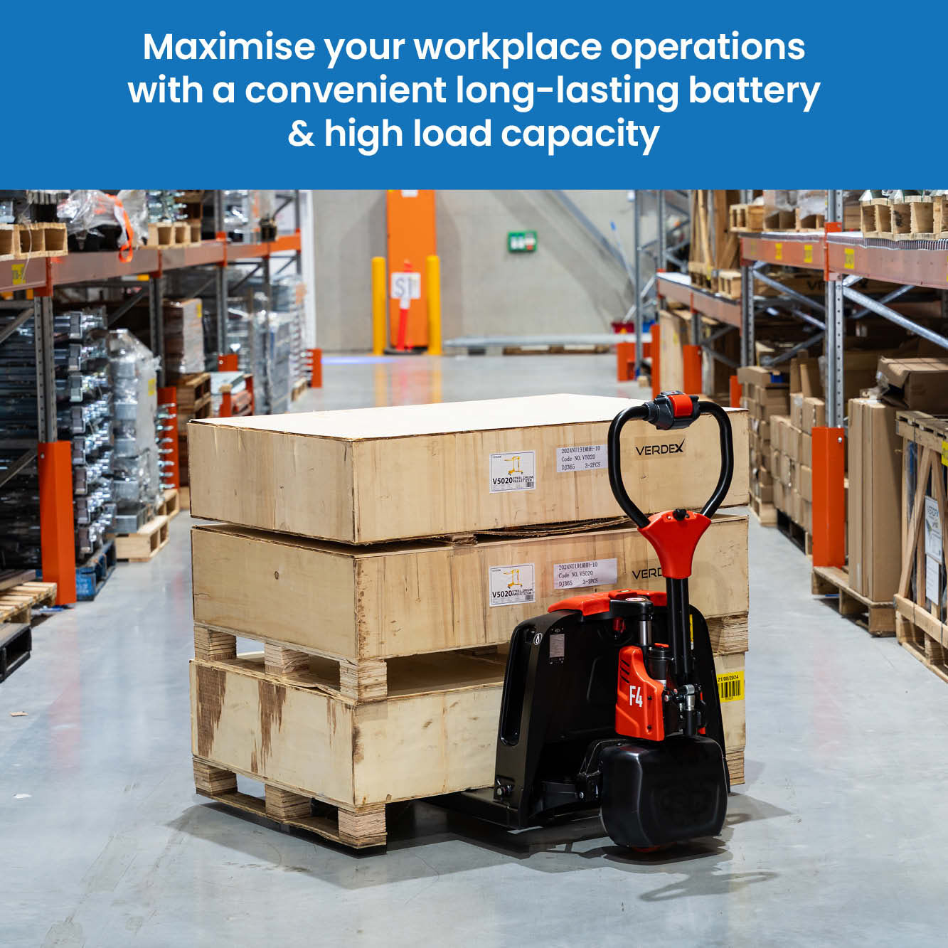 Powered by a long-lasting 24V 20 Ah lithium-ion battery, the Verdex Electric Pallet Truck delivers up to 4 hours of continuous operation per charge.
