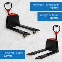 This unit features robust tines measuring 60 x 142 x 1070mm, with a total tine length of 1185mm. The minimum fork height is 85mm, and when fully lowered, the truck sits at just 82mm high, ideal for handling a variety of pallet types.