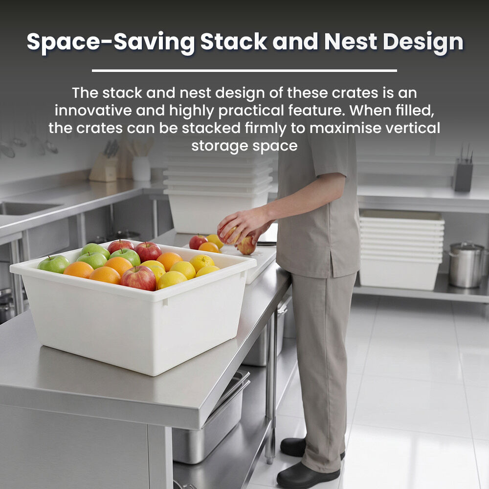 - Stack and nest design – Saves valuable storage space.